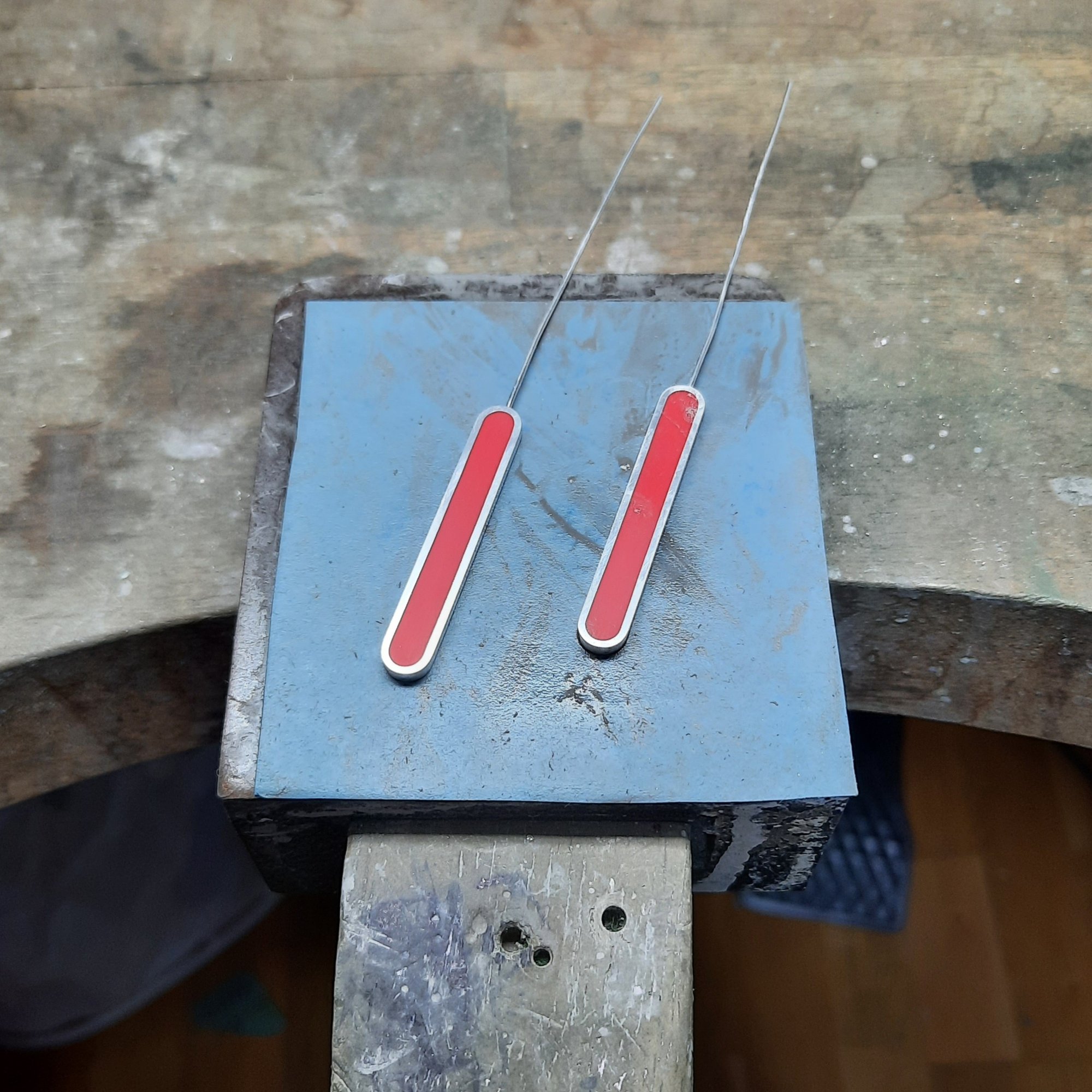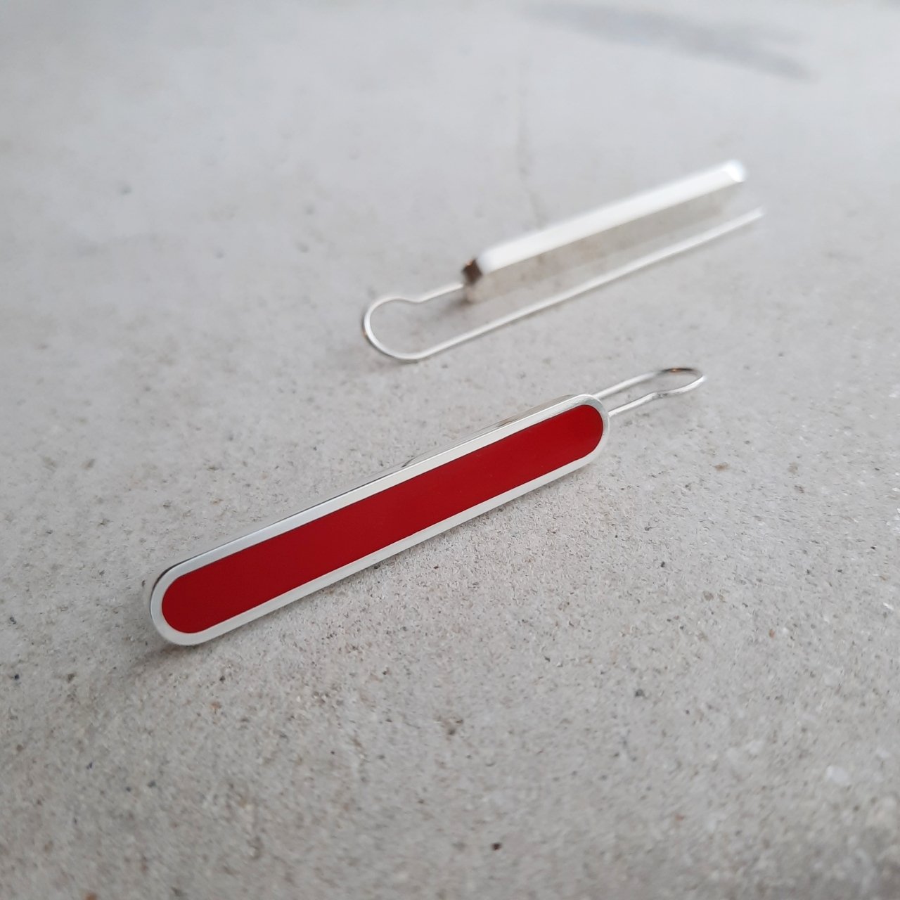 The earrings are rings are handmade from recycled Sterling silver and filled with vibrant red eco-resin. They are approx. 55mm long, measured from the top of the ear wires.
