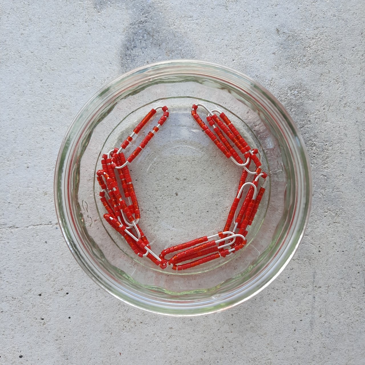 The neckpiece is handmade from recycled Sterling silver embellished with 1100 glistening Japanese glass beads. A beautiful handmade clasp filled with eco-resin mixed to a vibrant red completes the design.